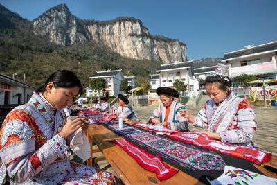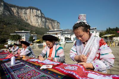 2023年1月8日,贵州省黔西市新仁苗族乡化屋村易地扶贫搬迁安置点,村民在刺绣。 近年来,黔西市新仁苗族乡化屋村在实施乡村振兴战略中加快扶持特色文化产业发展步伐,依托当地历史悠久的苗绣蜡染传统“非遗”技艺开办苗绣蜡染生产车间,将民族传统技艺与现代工艺相结合生产苗族服饰,助力苗族妇女在家门口就业增收。