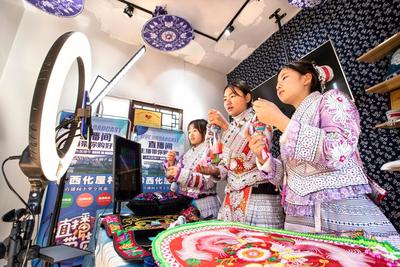2023年1月8日,贵州省黔西市新仁苗族乡化屋村易地扶贫搬迁安置点就业车间,村民直播苗绣蜡染产品。