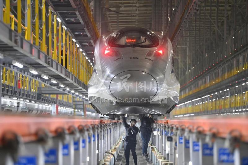 2023年1月11日,湖北襄阳,武汉动车段襄阳动车组运用所诊断工程师夜间检修动车组。