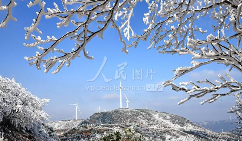 2023年1月16日,浙江省金华市磐安县龙源电力风电场雪后初霁,一台台风电机组在高山之巅迎风起舞,与雪景、青山构成一幅冬日生态美景。