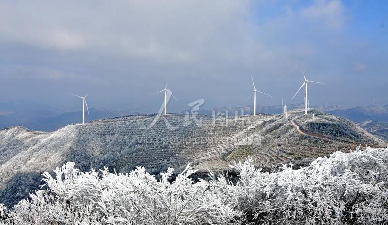 2023年1月16日,浙江省金华市磐安县龙源电力风电场雪后初霁,一台台风电机组在高山之巅迎风起舞,与雪景、青山构成一幅冬日生态美景。