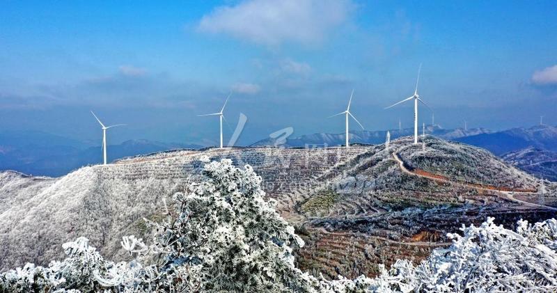 2023年1月16日,浙江省金华市磐安县龙源电力风电场雪后初霁,一台台风电机组在高山之巅迎风起舞,与雪景、青山构成一幅冬日生态美景。