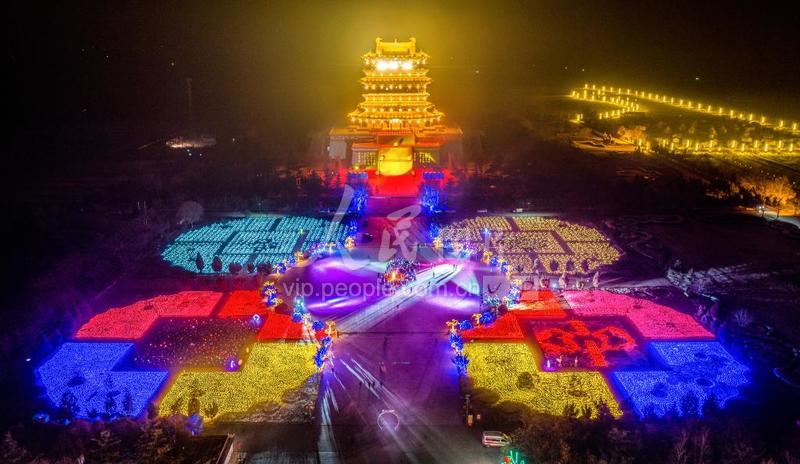 2023年1月16日,山西省运城市永济市“蒲坂民俗中国年”春节系列文化活动暨鹳雀楼光影演艺活动启幕,人们在绚丽的灯光下夜游鹳雀楼,欣赏传统的民俗表演,喜迎新春佳节。