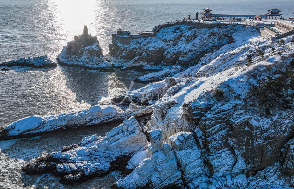 2023年1月25日,俯瞰被冰雪覆盖下的山东省荣成市成山头风景区。