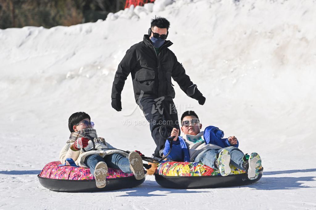 春节假期,许多游客来到山东省青州市驼山滑雪场,体验雪圈、滑雪等项目,感受冰雪运动激情。