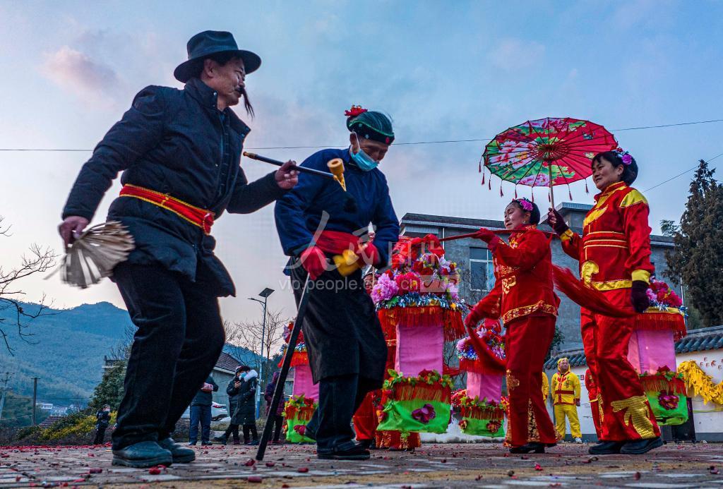 2023年1月24日,安徽省合肥市庐江县龙桥镇凌安村,村民挑花挑、唱民歌,多彩民俗闹新春。