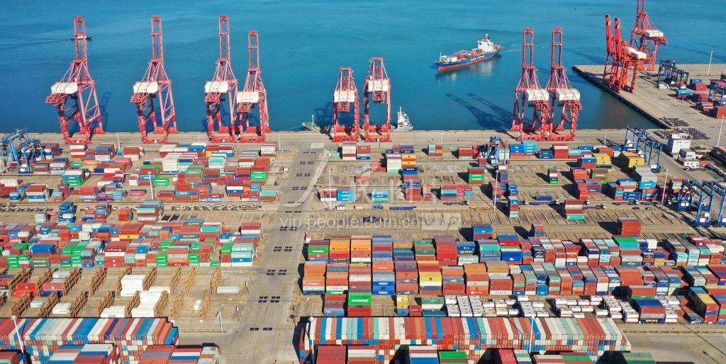 2023年1月25日,在江苏省连云港港集装箱码头,货轮满载集装箱准备停靠泊位。