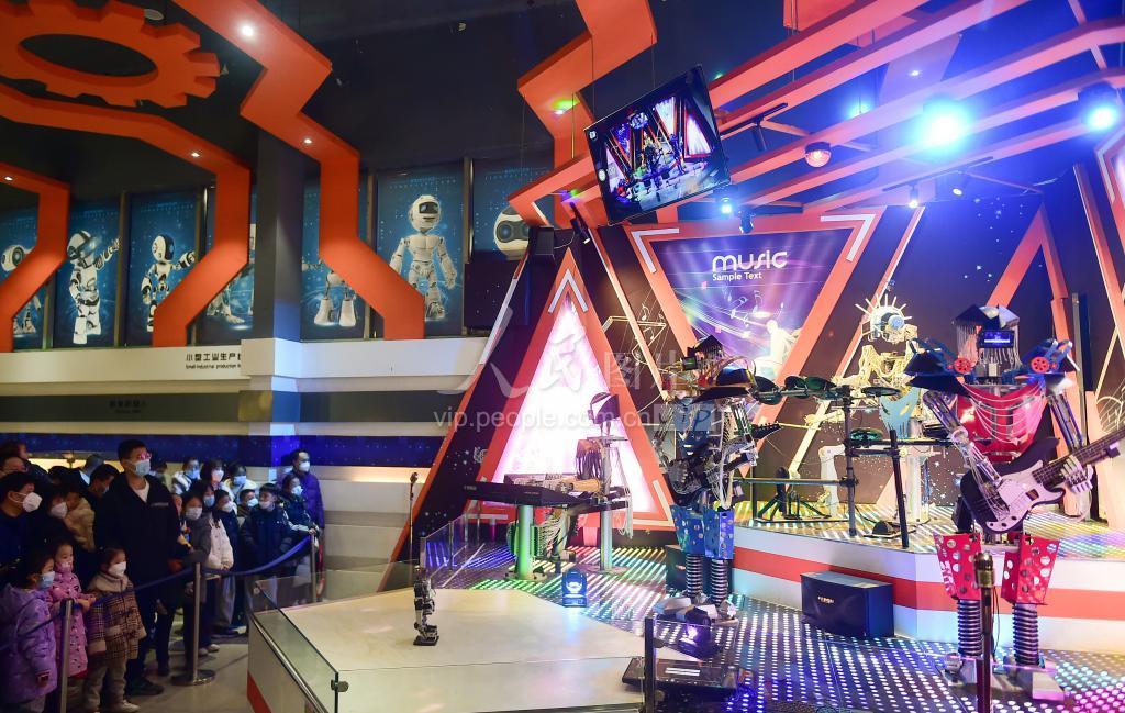 2023年1月27日,家长和小朋友们在河南省洛阳市科技馆参观体验“机器人乐队”科普设备,感受科技魅力。