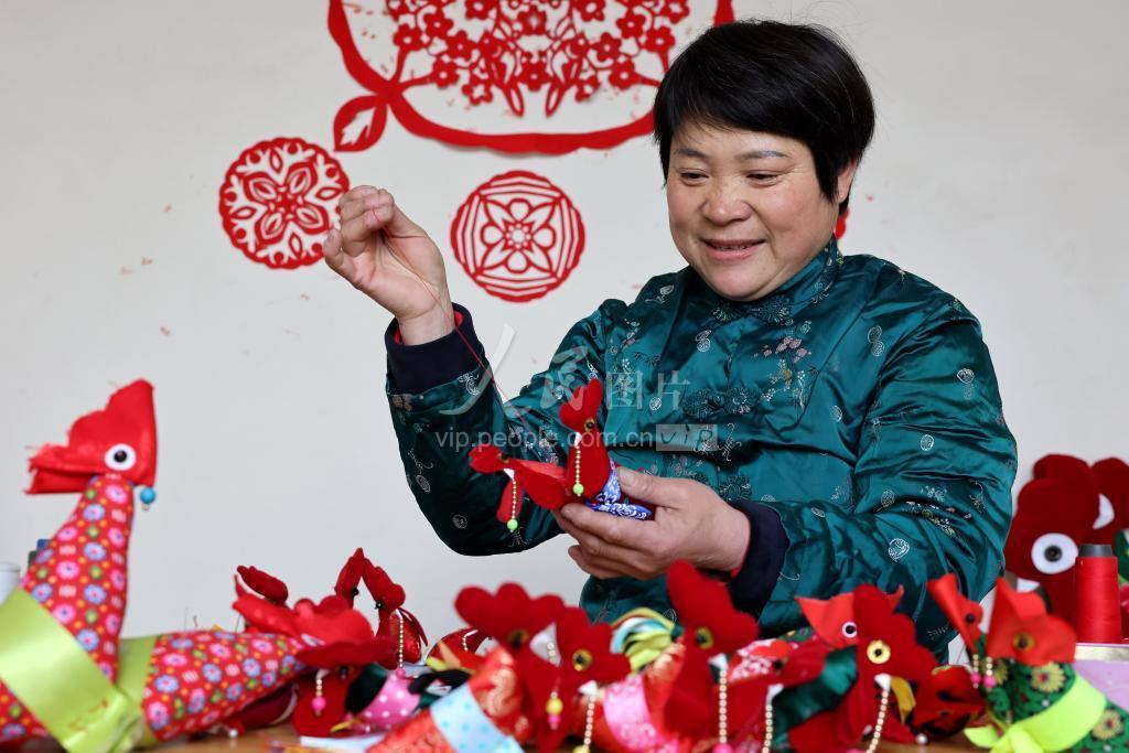 2023年1月31日,山东省枣庄市台儿庄区泥沟镇民间手工艺人赵瑞雪在家中缝制“春鸡”。