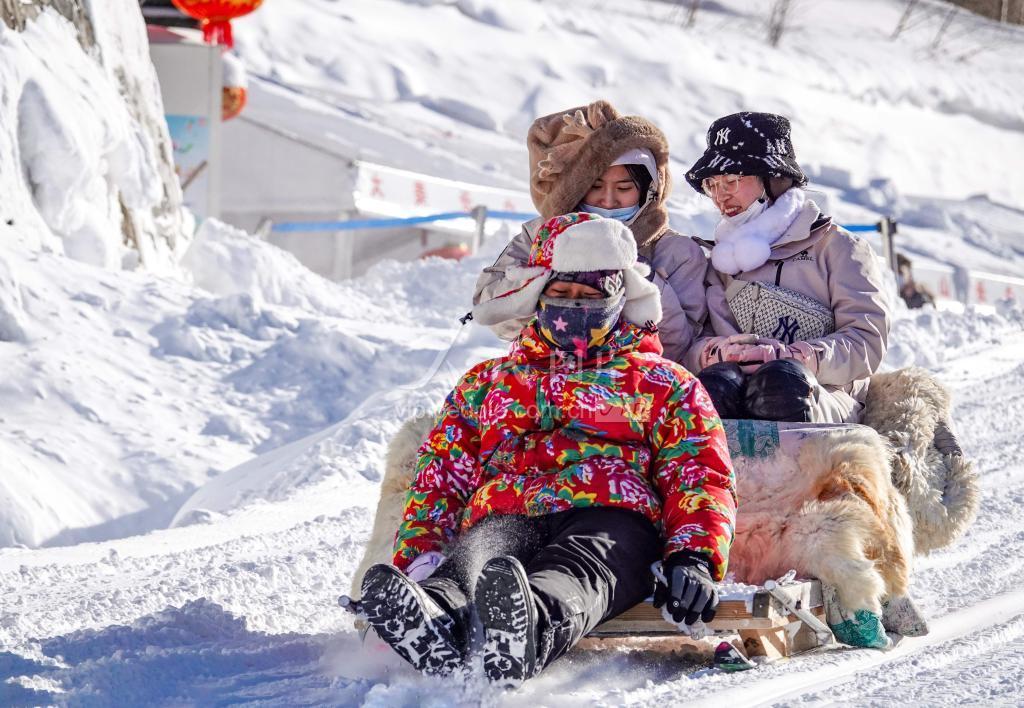 2023年2月2日,游客在景区体验雪橇滑雪项目。
