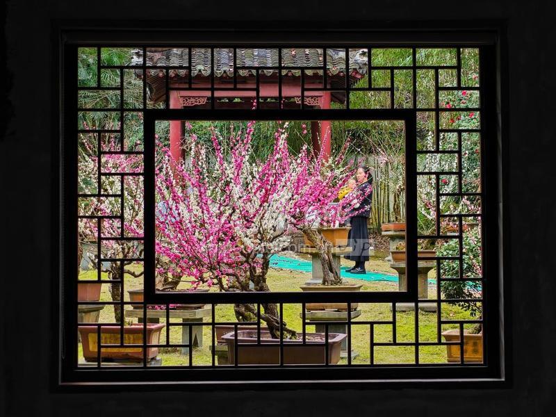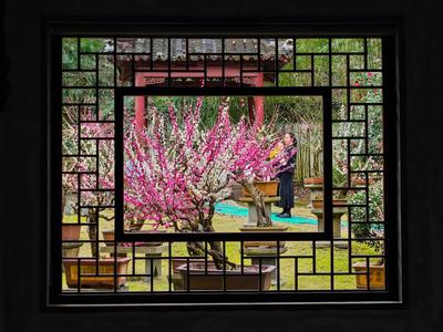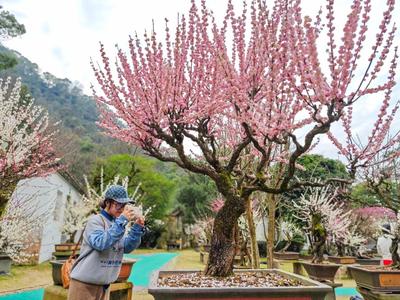 2023年2月12日,浙江省台州市黄岩区九峰公园报春园内,各式梅桩盆景争相吐蕊,美不胜收,吸引了不少游客前来踏春赏梅。