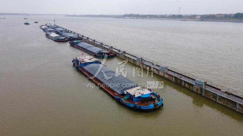 2023年2月13日,航拍浙江省金华市钱塘江中上游衢江航道上,货船排起长队,有序通过游埠船闸。