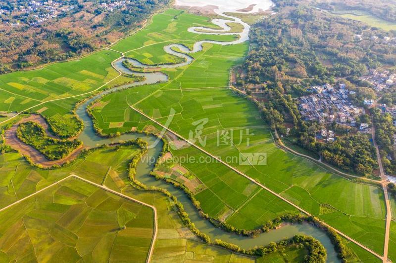 2023年2月11日,鸟瞰海南省海口市琼山区云龙镇的三十六曲溪湿地勃勃生机,蜿蜒曲折的河道与早稻田交汇出一幅春天画卷。 据了解,三十六曲溪在当地人口中被亲切称为“三十六道湾”。作为海口市琼山区重要的农业灌溉河流,滋润了周边广阔的农田,每年春季都会形成一道壮美的农田景观。