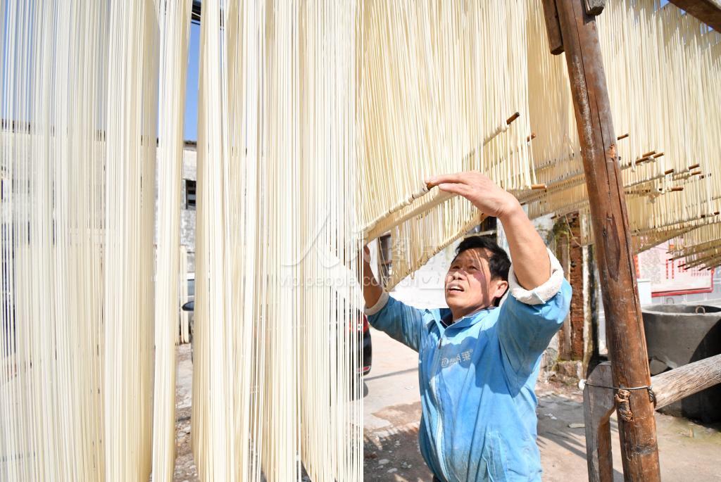 2023年2月16日,千年古镇——江西省抚州市金溪县浒湾镇老街区,当地油面师傅在晾晒油面。 “浒湾油面”是金溪县浒湾镇的传统名牌产品,始创于明朝末年,清代被选为宫廷食品,因面条匀净细长,状似龙须,故有“龙须贡面”之称。2010年,“浒湾油面”入选江西省非物质文化遗产名录。2011年,“浒湾油面”被认定为“中华老字号”。如今,仅浒湾镇老街区生产油面的作坊就达20余家。这些纯手工油面深受消费者青睐,成为当地一大富民产业。