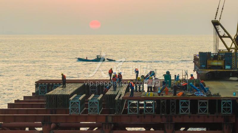 2023年2月16日,杭州湾跨海铁路大桥建设者正在搭建海上施工栈桥。