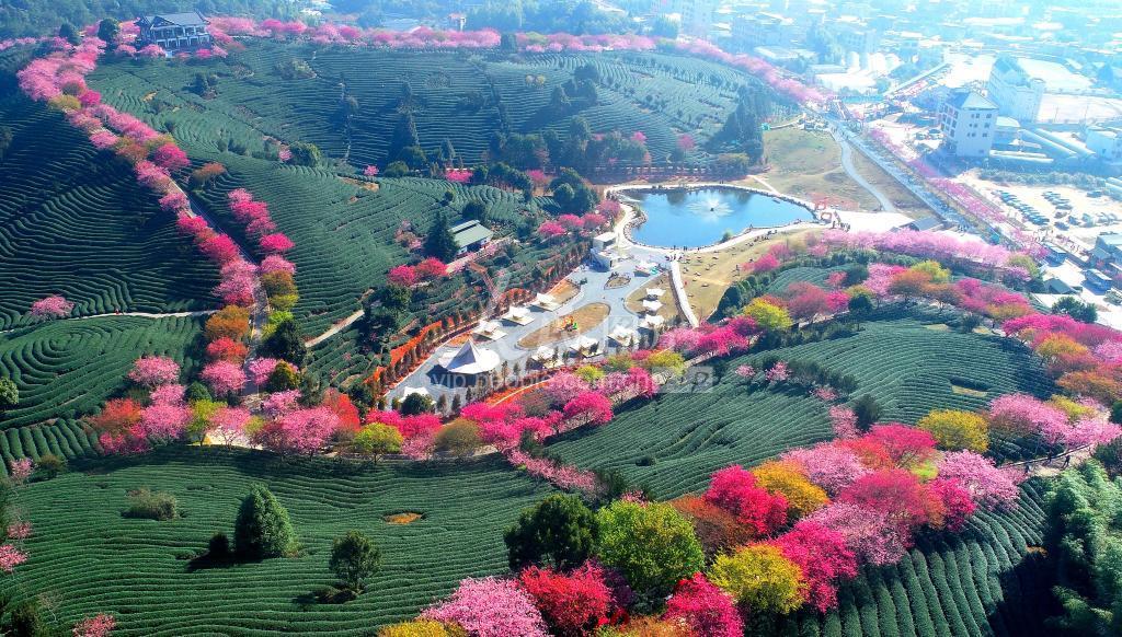 2023年2月17日,福建省龙岩市漳平市永福镇台品樱花茶园樱花盛开,景色美不胜收。 立春过后,闽西漳平市永福镇台品樱花茶园景区里数十万株、四十多个品种的樱花渐次绽放,红色的樱花与绿色的茶园相互映衬,构成一幅春意盎然、赏心悦目的多彩画卷。