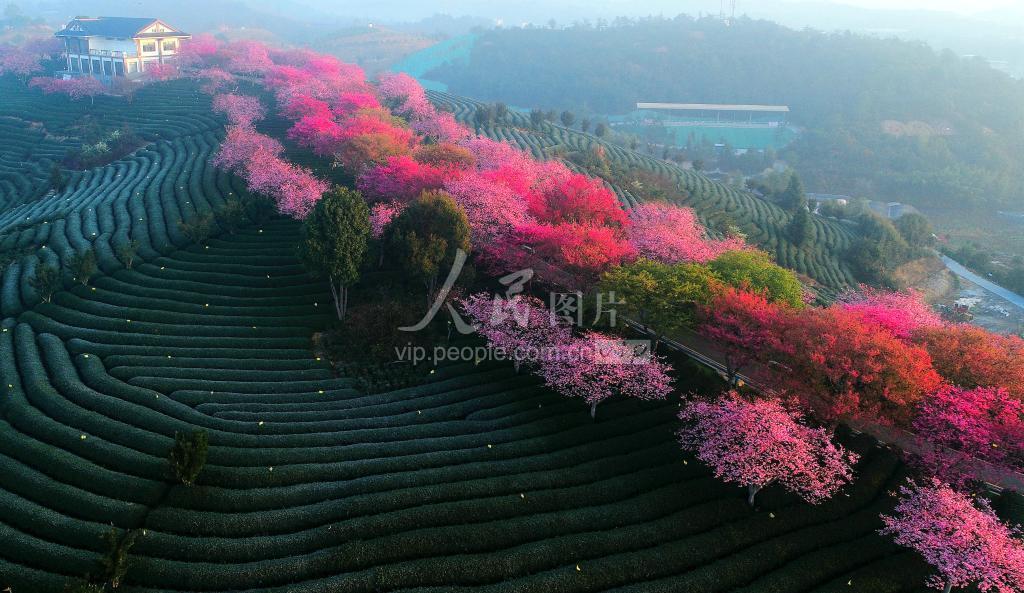 2023年2月17日,福建省龙岩市漳平市永福镇台品樱花茶园樱花盛开,景色美不胜收。 立春过后,闽西漳平市永福镇台品樱花茶园景区里数十万株、四十多个品种的樱花渐次绽放,红色的樱花与绿色的茶园相互映衬,构成一幅春意盎然、赏心悦目的多彩画卷。