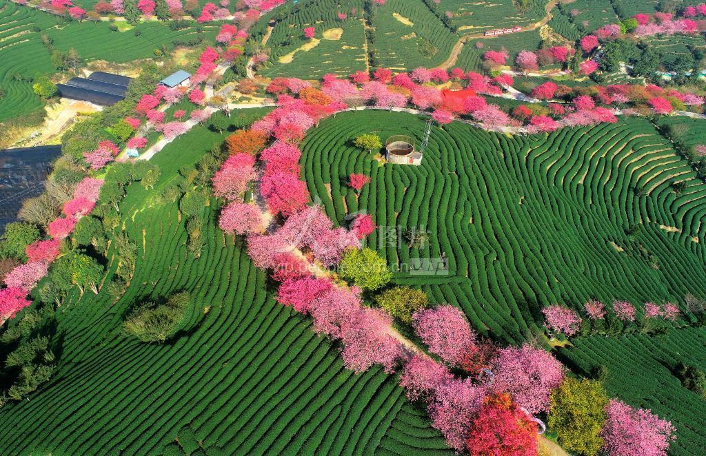 2023年2月17日,福建省龙岩市漳平市永福镇台品樱花茶园樱花盛开,景色美不胜收。 立春过后,闽西漳平市永福镇台品樱花茶园景区里数十万株、四十多个品种的樱花渐次绽放,红色的樱花与绿色的茶园相互映衬,构成一幅春意盎然、赏心悦目的多彩画卷。