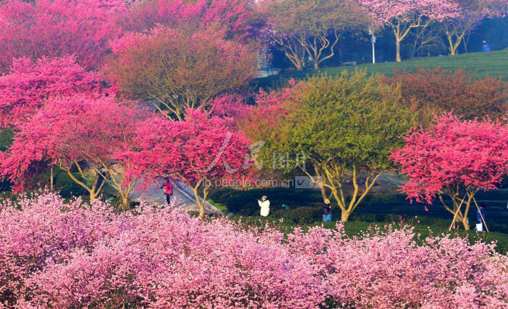 2023年2月17日,福建省龙岩市漳平市永福镇台品樱花茶园樱花盛开,景色美不胜收。 立春过后,闽西漳平市永福镇台品樱花茶园景区里数十万株、四十多个品种的樱花渐次绽放,红色的樱花与绿色的茶园相互映衬,构成一幅春意盎然、赏心悦目的多彩画卷。