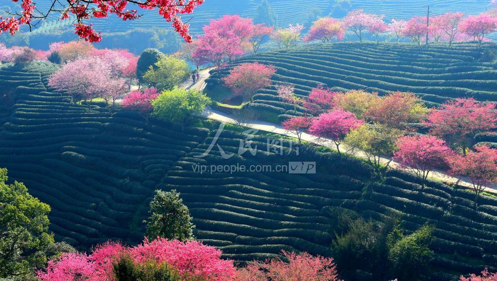 2023年2月17日,福建省龙岩市漳平市永福镇台品樱花茶园樱花盛开,景色美不胜收。 立春过后,闽西漳平市永福镇台品樱花茶园景区里数十万株、四十多个品种的樱花渐次绽放,红色的樱花与绿色的茶园相互映衬,构成一幅春意盎然、赏心悦目的多彩画卷。