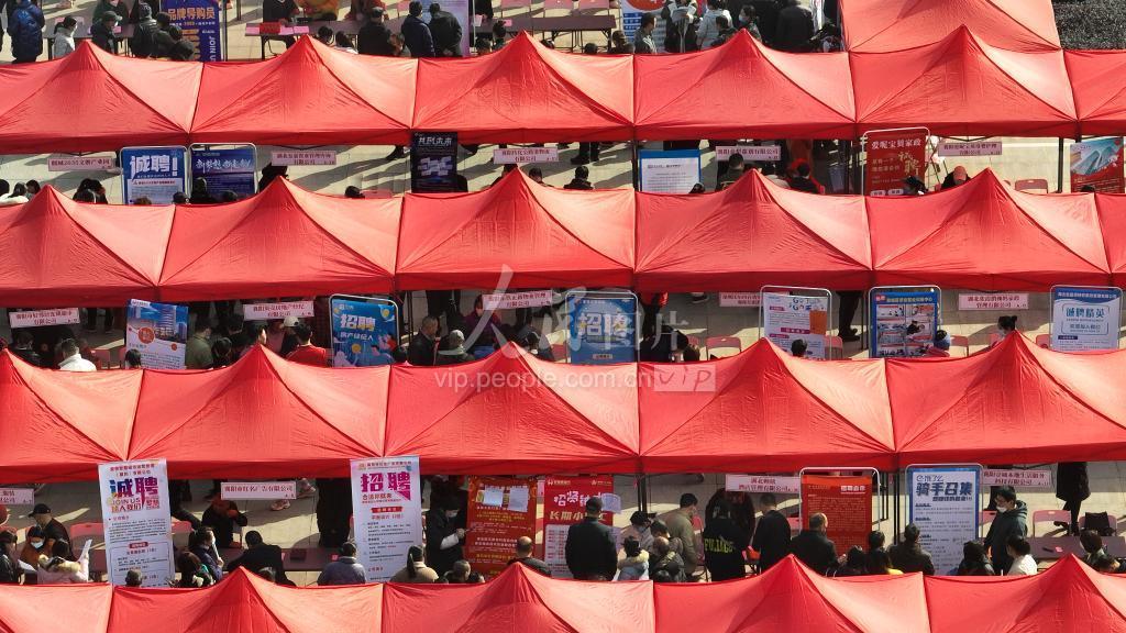 2023年2月20日,湖北省襄阳市举行“春送岗位 企盼你来”——2023年襄阳市服务重点行业、重点企业系列活动启动仪式(无人机照片)。 为全面推广全国总工会“工E就业”服务平台,常态化开展“企业找人才、职工找岗位”就业服务活动,襄阳市总工会决定在全市范围开展“春送岗位 企盼你来”——2023年襄阳市服务重点行业、重点企业系列活动。招聘会设立“线下+线上”双通道送岗位,不仅有招工需求的企业现场招聘,还在招聘会现场设置“春风在线”直播间,通过用工单位人事专员代表现场直播推介岗位联动媒体实地探访用工单位的形式,让求职者足不出户即可全方位直观了解用工单位的薪酬待遇、工作环境等信息。