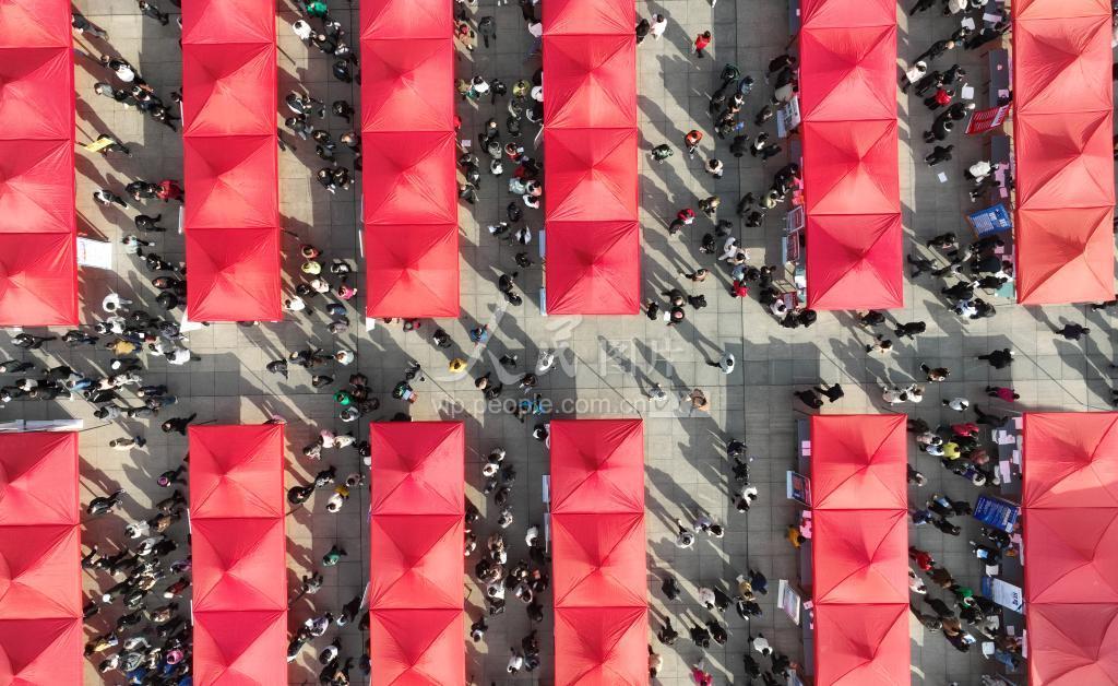 2023年2月20日,湖北省襄阳市举行“春送岗位 企盼你来”——2023年襄阳市服务重点行业、重点企业系列活动启动仪式(无人机照片)。 为全面推广全国总工会“工E就业”服务平台,常态化开展“企业找人才、职工找岗位”就业服务活动,襄阳市总工会决定在全市范围开展“春送岗位 企盼你来”——2023年襄阳市服务重点行业、重点企业系列活动。招聘会设立“线下+线上”双通道送岗位,不仅有招工需求的企业现场招聘,还在招聘会现场设置“春风在线”直播间,通过用工单位人事专员代表现场直播推介岗位联动媒体实地探访用工单位的形式,让求职者足不出户即可全方位直观了解用工单位的薪酬待遇、工作环境等信息。