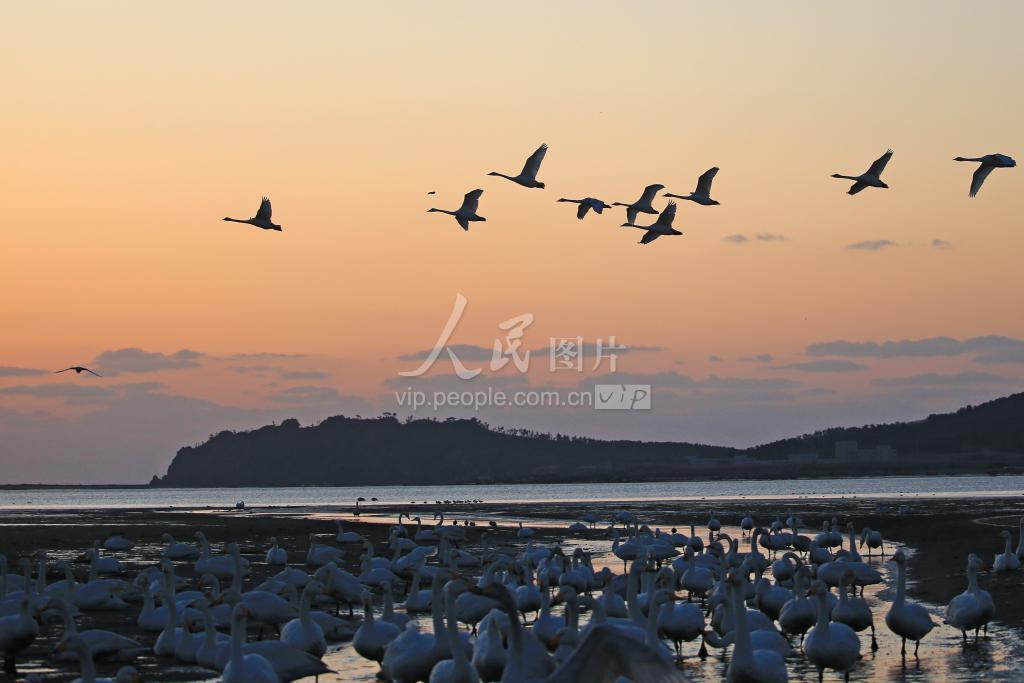 2023年2月21日清晨,在山东省荣成市天鹅湖,大天鹅映着朝晖成群结队飞舞,场面壮观,吸引着不少游客和摄影爱好者前来观赏、拍摄。 据荣成大天鹅国家级自然保护区工作人员介绍,目前大天鹅已进入迁徙季,已有500余只大天鹅踏上回迁之旅,大批没开始回迁的大天鹅们频繁练飞,随时准备回迁。为保证大天鹅有充足体力回迁,保护区工作人员定时为大天鹅投食。山东荣成是中国大天鹅之乡,每年有近万只大天鹅来此越冬。