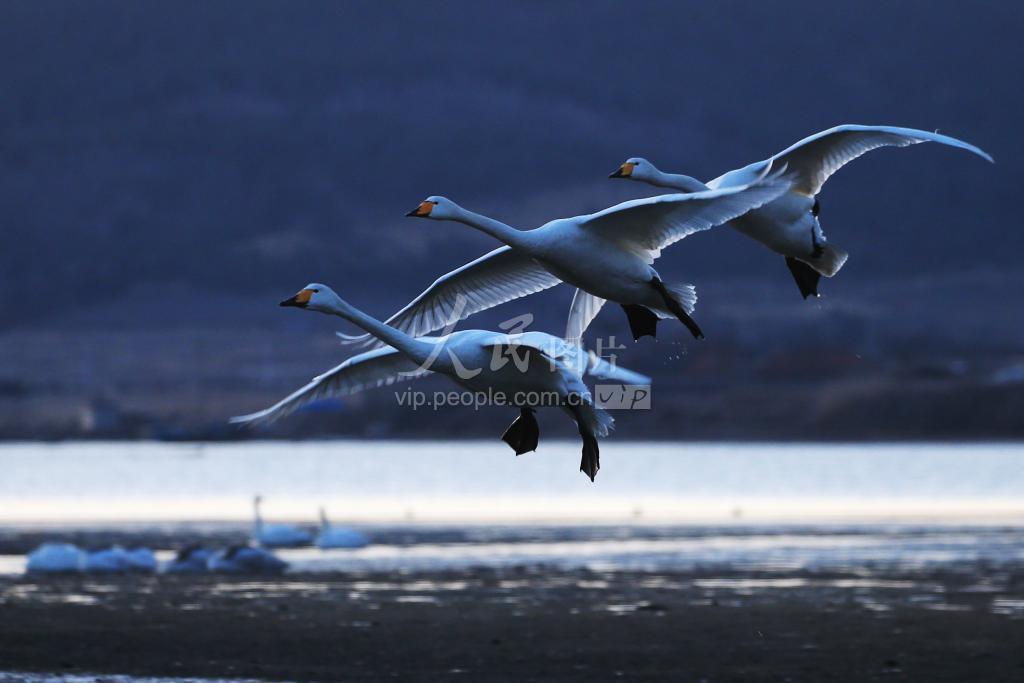 2023年2月21日清晨,在山东省荣成市天鹅湖,3只大天鹅降落在湖畔。