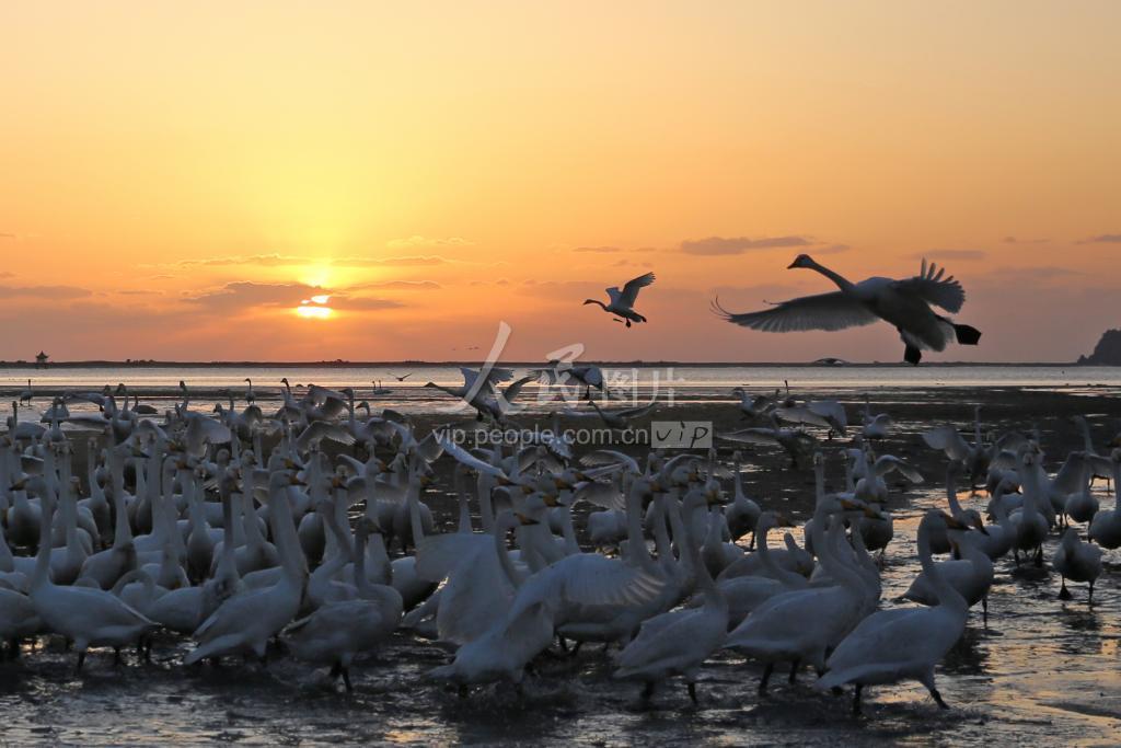 2023年2月21日清晨,在山东省荣成市天鹅湖,大天鹅映着朝晖成群结队飞舞,场面壮观,吸引着不少游客和摄影爱好者前来观赏、拍摄。 据荣成大天鹅国家级自然保护区工作人员介绍,目前大天鹅已进入迁徙季,已有500余只大天鹅踏上回迁之旅,大批没开始回迁的大天鹅们频繁练飞,随时准备回迁。为保证大天鹅有充足体力回迁,保护区工作人员定时为大天鹅投食。山东荣成是中国大天鹅之乡,每年有近万只大天鹅来此越冬。