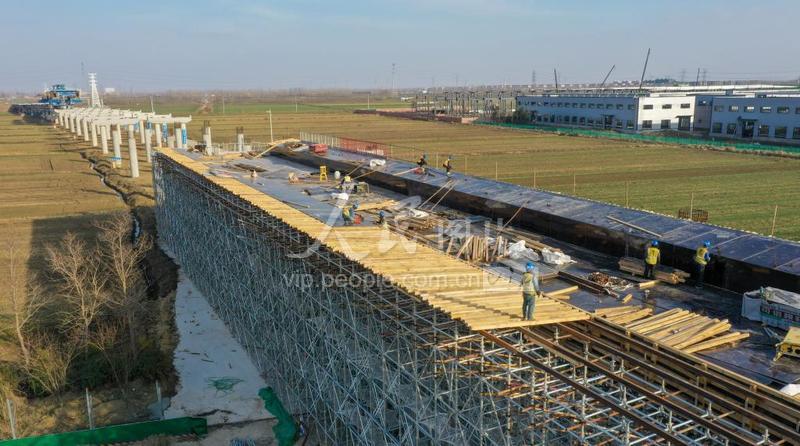 2023年2月21日,在江苏省宿迁市盐洛高速公路宿城至泗洪段工程一施工现场,工人们正在全力以赴抢工期建设,确保项目早日完工。