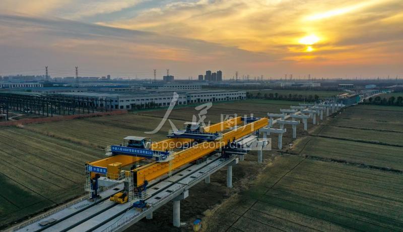 2023年2月21日,在江苏省宿迁市盐洛高速公路宿城至泗洪段工程一施工现场,大型智能造桥机正在安装箱梁。