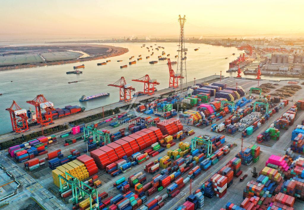 2023年2月26日,在长江江苏省张家港段,一艘艘装载生产生活物资的船舶在江面上往返穿梭,港口集装箱装卸一派繁忙景象。