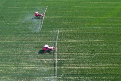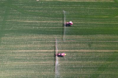 2023年2月27日,在安徽省阜阳市颍州区三塔集镇徐寨村,当地一家农机服务专业合作社组织自走式植保喷雾机械对托管的小麦进行田间管理(无人机拍摄)。
