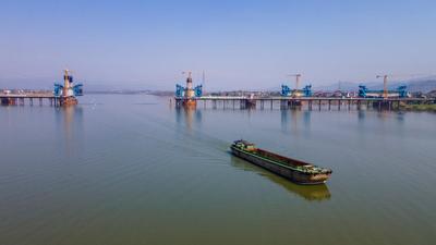 2023年2月27日,航拍浙江省金华市兰江水域,金建高铁兰江特大桥正在上部梁体施工。