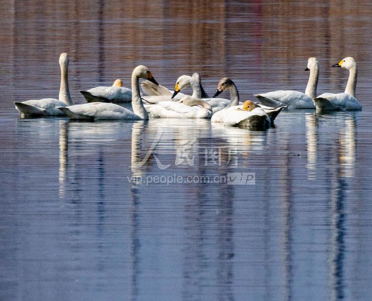 2023年3月5日,在安徽省淮北市杜集区百莲百荷湿地公园,一群迁徙的天鹅在时休憩“打卡”。 近年来 当地持续加大生态建设力度,不断改善生态环境,积极推进沉陷区水资源利用与生态修复,如今,淮北多处湿地成了候鸟迁徙中转站和栖息地。