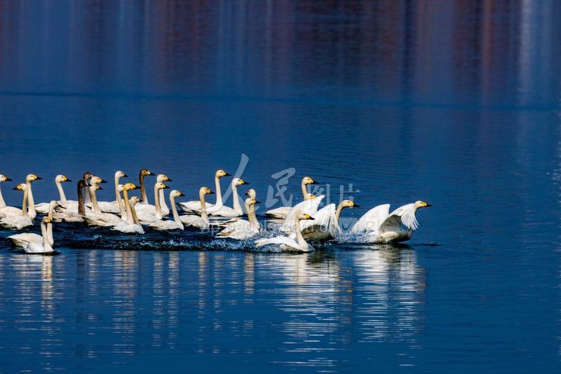 2023年3月5日,在安徽省淮北市杜集区百莲百荷湿地公园,一群迁徙的天鹅在时休憩“打卡”。 近年来 当地持续加大生态建设力度,不断改善生态环境,积极推进沉陷区水资源利用与生态修复,如今,淮北多处湿地成了候鸟迁徙中转站和栖息地。