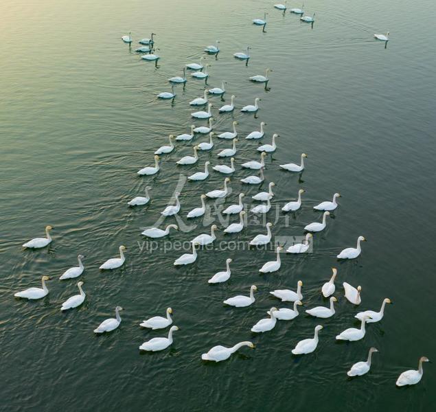 2023年3月5日,在安徽省淮北市杜集区百莲百荷湿地公园,一群迁徙的天鹅在时休憩“打卡”。 近年来 当地持续加大生态建设力度,不断改善生态环境,积极推进沉陷区水资源利用与生态修复,如今,淮北多处湿地成了候鸟迁徙中转站和栖息地。