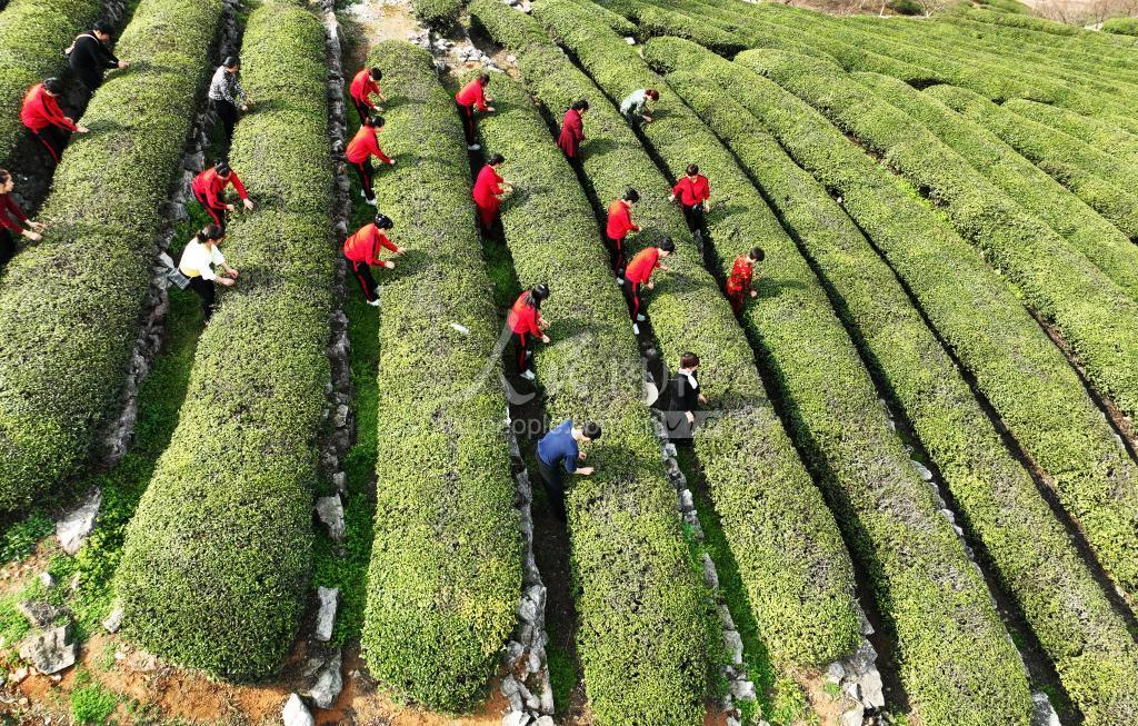 2023年3月8日,游客在湖北省宜都市枝城镇架锅山村茶园体验摘茶。大地回春,万物复苏,游客沐浴春光,踏春赏花观景,快乐乡村游。