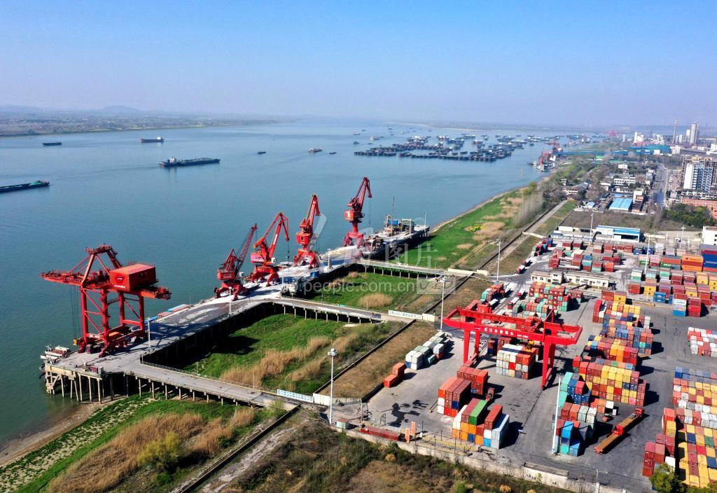 2023年3月13日,在安徽铜陵港长江横港港区,港口机械装卸繁忙,运输船舶来往穿梭。