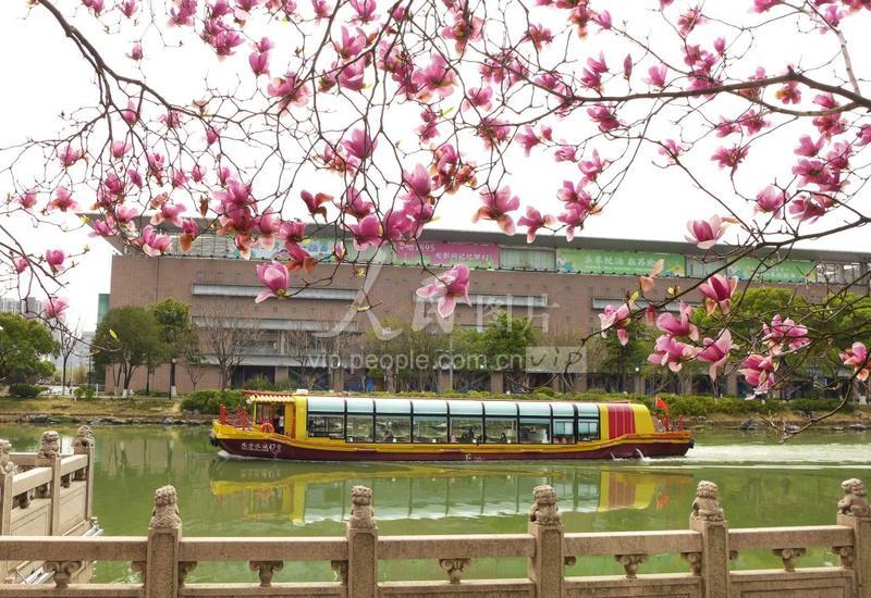 3月15日,一艘游船在朵朵玉兰花掩映在苏州环城河水面行驶。