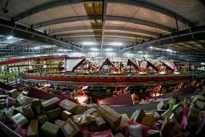 2023年3月16日,江苏省宿迁市沭阳县一家快递公司自动分拣中心,工作人员在自动分拣设备上进行分拣、打包快递,现场一片繁忙景象。 据悉,江苏省宿迁市沭阳县是全国闻名的“花木之乡”,春季苗木销售旺季带来快递行业运转高峰,该县构建“县有园区、镇有集中区、村有网点”三级寄递物流体系,实现“快递进村”100%全覆盖,让花乡特色产品走出去,为乡村发展打开新空间,为百姓增收拓宽了渠道。