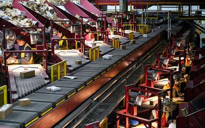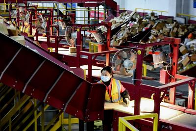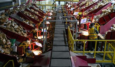 2023年3月16日,江苏省宿迁市沭阳县一家快递公司自动分拣中心,工作人员在自动分拣设备上进行分拣、打包快递。