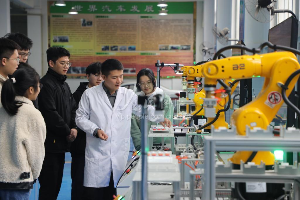 2023年3月17日,在安徽省合肥市肥西县紫蓬山脚下的安徽文达信息工程学院,老师在智能制造工程训练中心给学生讲解现代汽车机械臂应用。