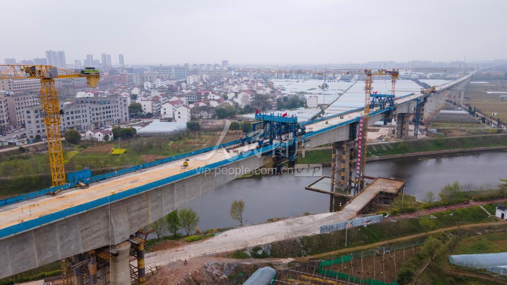 2023年3月18日,浙江省金华市浦江县浦阳江上,杭温铁路二期项目浦江特大桥正在建设中。