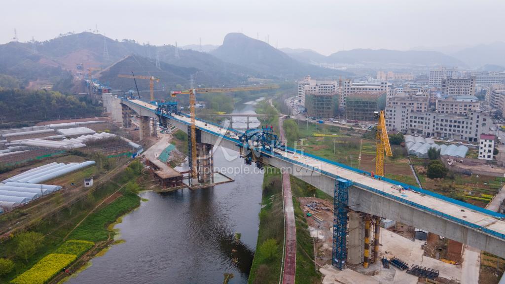 2023年3月18日,浙江省金华市浦江县浦阳江上,杭温铁路二期项目浦江特大桥正在建设中。