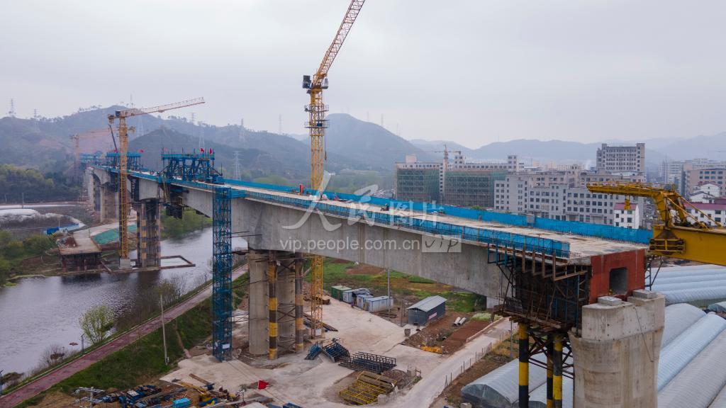 2023年3月18日,浙江省金华市浦江县浦阳江上,杭温铁路二期项目浦江特大桥正在建设中。