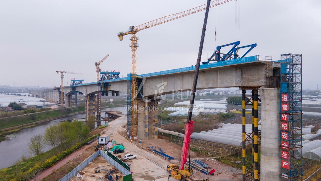 2023年3月18日,浙江省金华市浦江县浦阳江上,杭温铁路二期项目浦江特大桥正在建设中。