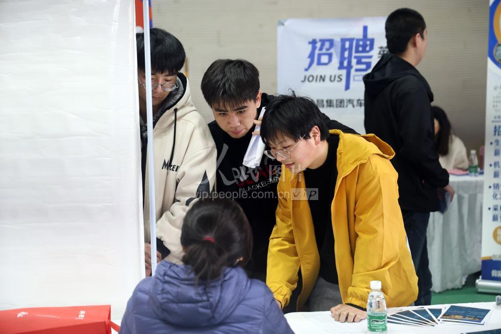 2023年3月18日,在江苏省南通市,大学生在招聘会现场与用人单位咨询相关情况。