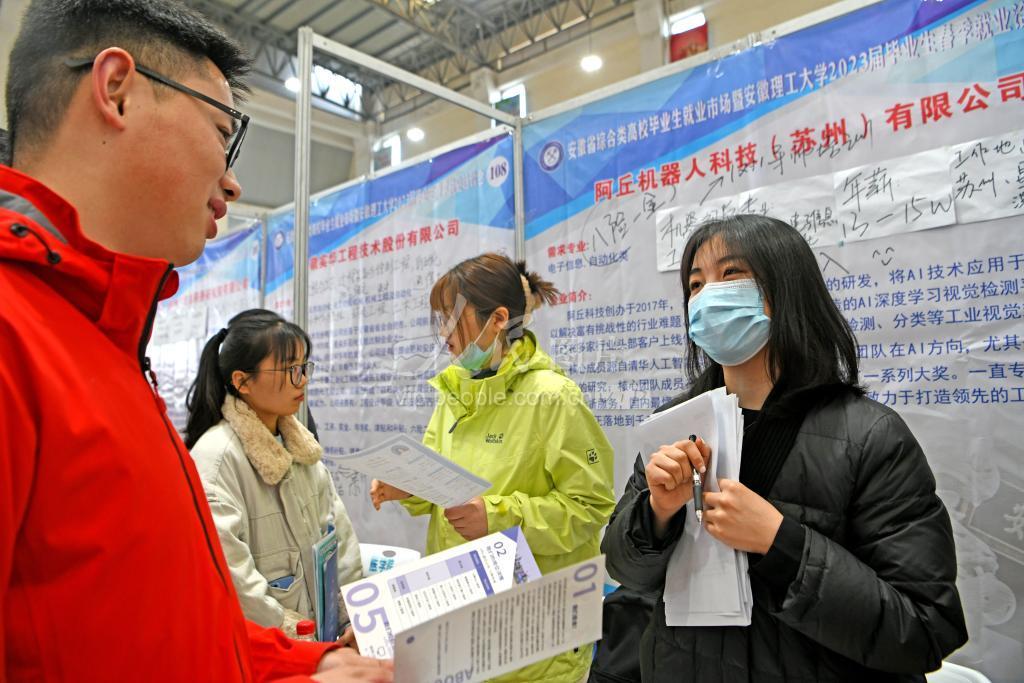 2023年3月18日,安徽理工大学大学生在校园春季就业洽谈会上应聘。