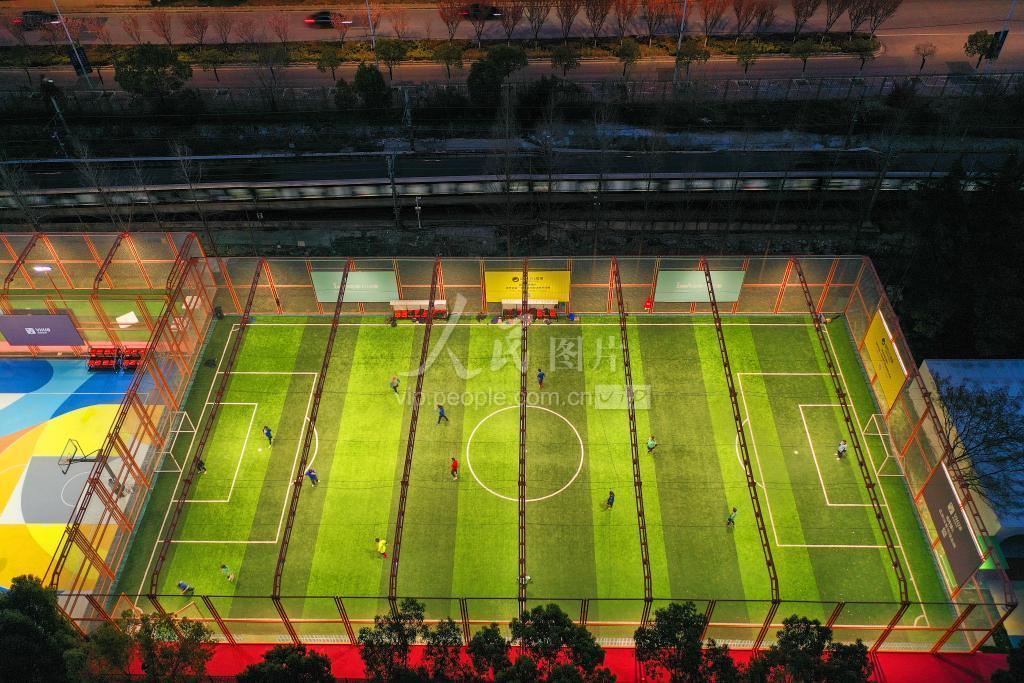 2023年3月18日,在位于江苏省南京市建邺区的24小时城市体育街区,市民在开放试运营的球场运动,一列地铁从不远处驶过。